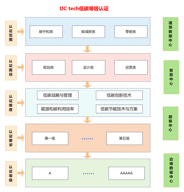 为响应国家“双碳”战略并支撑行业高质量发展,中国信通院推出DC Tech算力中心低碳等级认证。该认证依据国家标准GB/T 43331-2023《互联网数据中心(IDC)技术和分级要求》,通过科学分级体系推动算力基础设施低碳转型。