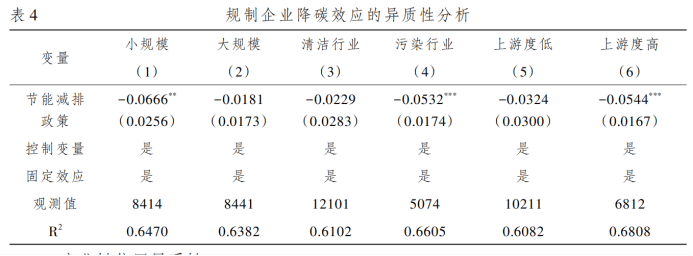 政策效果在不同企业类型之间存在明显差异。小规模企业的降碳效应显著强于大规模企业,说明小企业在生产调整和政策响应上更为灵活;污染行业企业的降碳作用显著,而清洁行业并不显著,反映出高耗能高排放行业本身具有更大的节能空间;处于产业链上游的企业降碳效应也更强,这与上业能源消耗基数大、直接排放更集中有关。整体上,政策更容易作用于高能耗、高排放、调整空间更大的企业。
