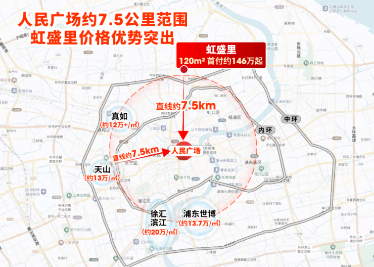项目直线公里,在真如、徐汇滨江、天山、世博等同等区位板块中,是价格更划算的新房选择。