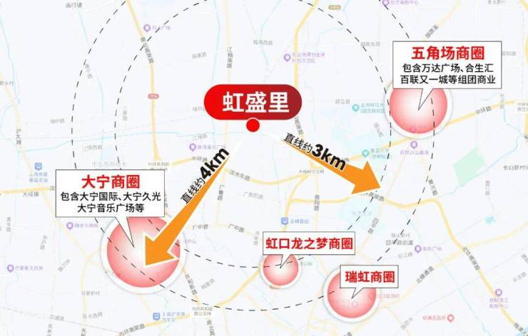 1公里内直达万达广场、吉买盛超市3公里内覆盖大宁国际、久光中心、五角场合生汇、龙之梦等顶级商圈